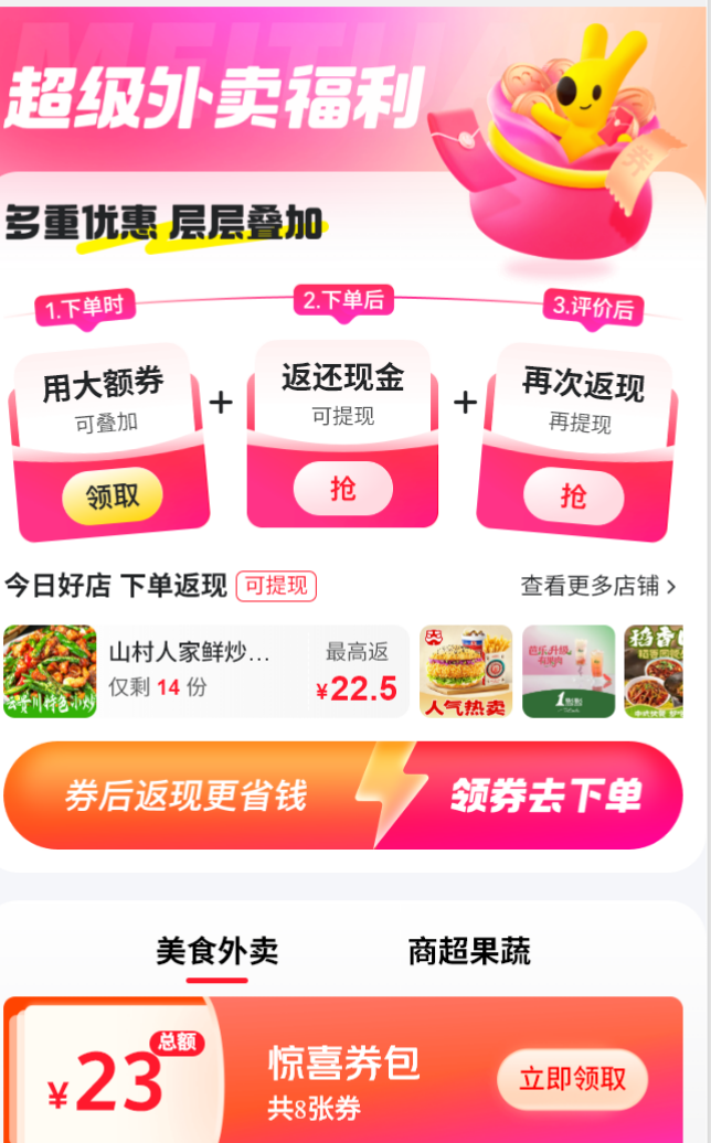 包含外卖券和商超果蔬券。 可用美团外卖使用, 具体领券内容以实际为准。